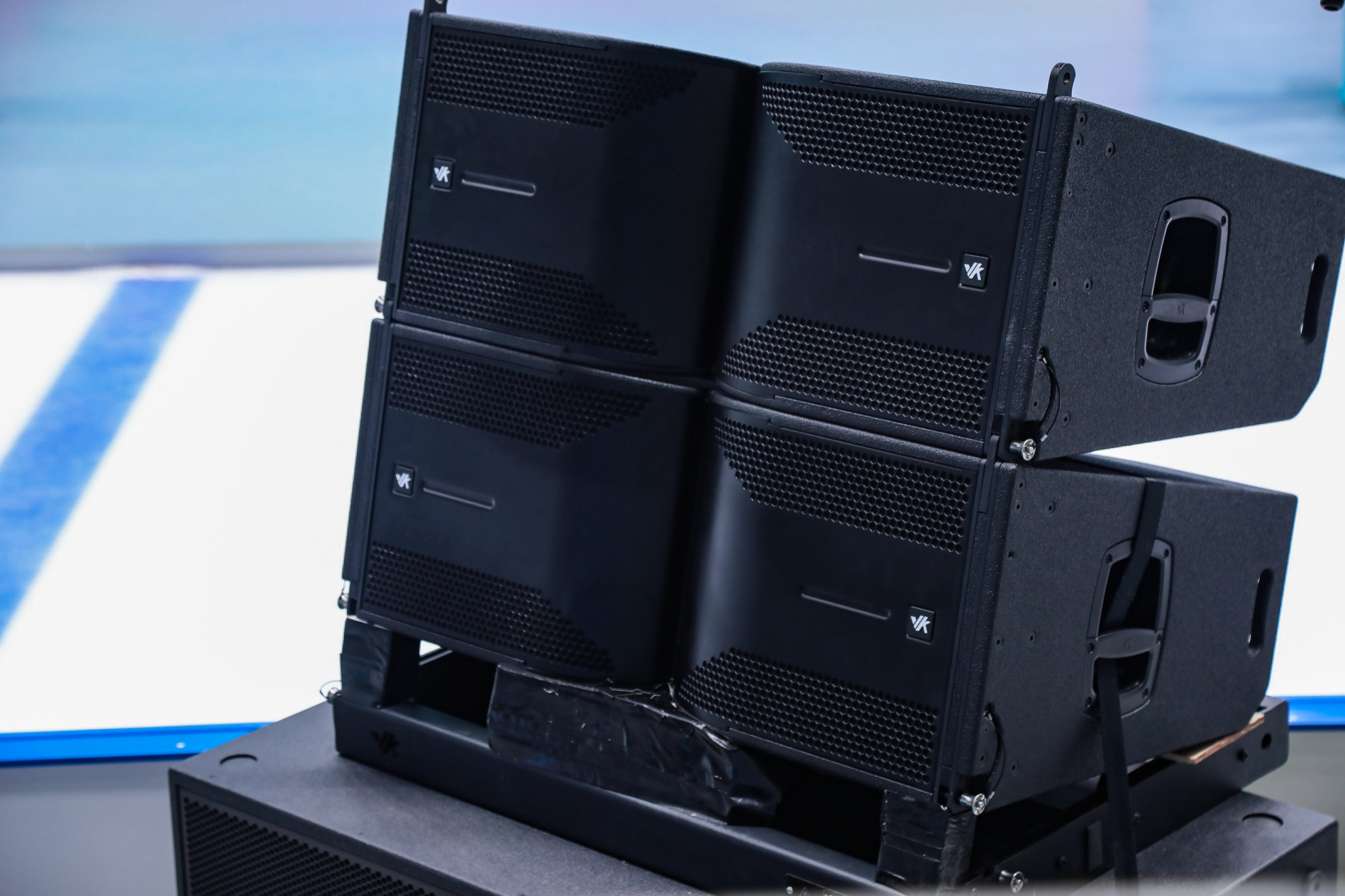 主扩声PA系统采用了LUCA系列双10寸三分频线阵列扬声器,同时搭配双18寸超低频扬声器,分别在舞台左右两边放置,组合成四分频立体声系统(5+1组合摆放)。LUCA系列扬声器选用意大利进口单元,组合成中高音同轴结构,号角为水平100°×垂直10°,并且结合创新型SIW波导号角技术,使得各区域音色更加均匀清晰细腻。